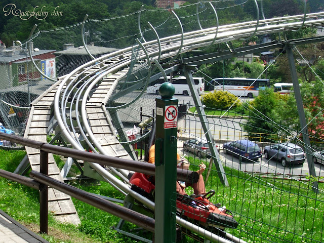 No i właśnie. Podczas tegorocznych wakacji napstrykałam całe mnóstwo pięknych zdjęć z wypraw w czeskie górki. Wyszło mi to nawet nieźle. Gorzej z tym poniżej... Jula bardzo chciała mieć zdjęcie ze zjazdu. Żeby spełnić życzenie córeczki, stałam w upale obarczona wielkim plecakiem i wszystkim innym wycieczkowym durnostrojstwem, około dwudziestu minut. W dłoni trzymałam ustawiony idealnie aparat. Kiedy już prawie zesztywniałam od tego stania, nadjechali moi. Niestety, okazało się, że czmychnęli za prędko i... zobaczcie sami...
